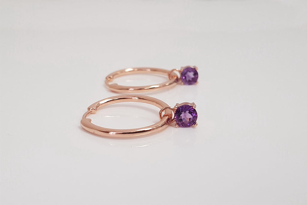 Pendientes argollas en plata con baño de oro rosa y amatistas
