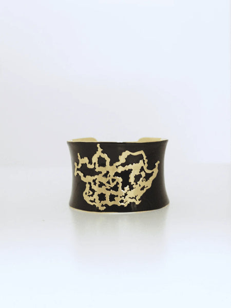 Discover the soul of Switzerland in this impeccable bronze bracelet, enameled and plated in 18- karat gold. Its precise, minimalist design traces the heart of the Alps like a treasure chest of beauty: from the icy summit of the Matterhorn to the mirror-like lakes of Lucerne and Geneva, from the verdant meadows where cowbells ring out to the terraced vineyards of Lavaux that slope down towards Lake Geneva.